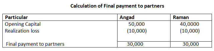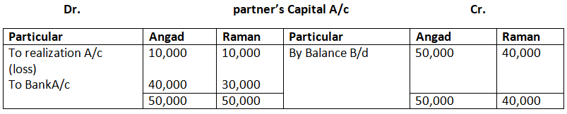 39. There are two partners Angad and Raman in a firm and their capitals are ₹ 50,000 and ₹ 40,000. The creditors are ₹ 30,000. The assets of the firm realize ₹ 1,00,000. How much will Angad and Raman receive?