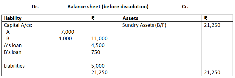 41. A and B were partners sharing profits and Losses as 7/11th to A and 4/11th to B. they dissolved the partnership on 30th may, 2023. As on that date their capitals were: A ₹ 7,000 and B ₹ 4,000. There were also interest due on loan A/c to A ₹ 4,500 and to B ₹ 750. The other liabilities amounted to ₹ 5,000. The assets proved to have been undervalued in the last Balance Sheet and actually realized ₹ 24,000.