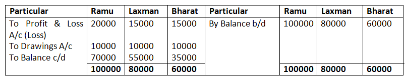 42. Ramu, Laxman and Bharat started business on 1st April, 2024 with capital of Rs.1,00,000, Rs.80,000 and Rs.60,000 respectively sharing profits and losses in the ratio of 4:3:3. For the year ending 31st March, 2025, the firm incurred loss of Rs.50,000. Each of the partners withdrew Rs.10,000 during the year.