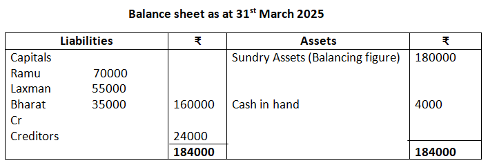 On 1st April, 2025, the firm was dissolved. Creditors of the firm stood at Rs.24,000 on that date and cash in hand was Rs.4,000. Assets realized Rs.3,00,000 and creditors were paid Rs.23,500 in settlement of their claims.