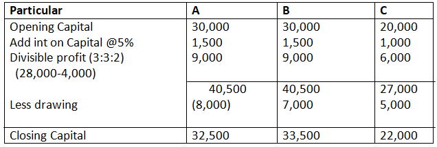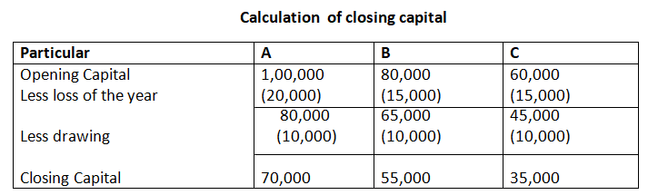 43. A,B and C started business on 1st April, 2024 with capitals of ₹ 1,00,000; ₹ 80,000 and 60,000 respectively sharing profits (losses) in the ratio of 4:3:3. For the year ended 31st March, 2024, firm incurred loss of ₹ 50,000. Each of the partners withdrew ₹ 10,000 during the year.