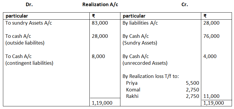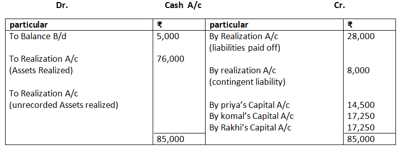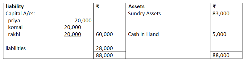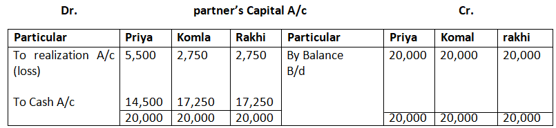 44. Priya, Komal and Rakhi were in partnership sharing profits and losses in the ration of 2:1:1. They decided to dissolve the partnership. On that date of dissolution, Sundry Assets (including cash ₹ 5000) amounted to ₹ 88,000 assets realized ₹ 80,000 was paid by the firm. The capital Account of Priya, Komal and Rakhi showed a balance of ₹ 20,000 each.