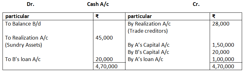The assets represented by the above stated net liabilities realized ₹ 4,50,000 exclusive of owed by B. The liabilities were settled at book figures. Prepare Realization Account, Partner’s Capital Account and Cash Account showing the distribution to the partners.