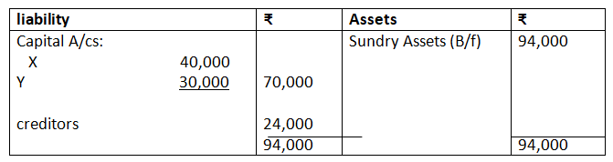 46. X and Y were partners sharing profits and losses in the ratio of 3:2. They decided to dissolve the firm on 31st March, 2025. On that date, their Capitals were X- ₹ 40,000 and Y-30,000. Creditors amounted to ₹ 24,000.
