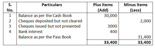4. Pass Book shows a debit of 1,000 for bank charges and credit of 2,000 as interest.