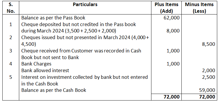 3. Two cheques of 500 and 650 sent to the bank for collection were not entered in the Pass Book by 31st July, 2024.