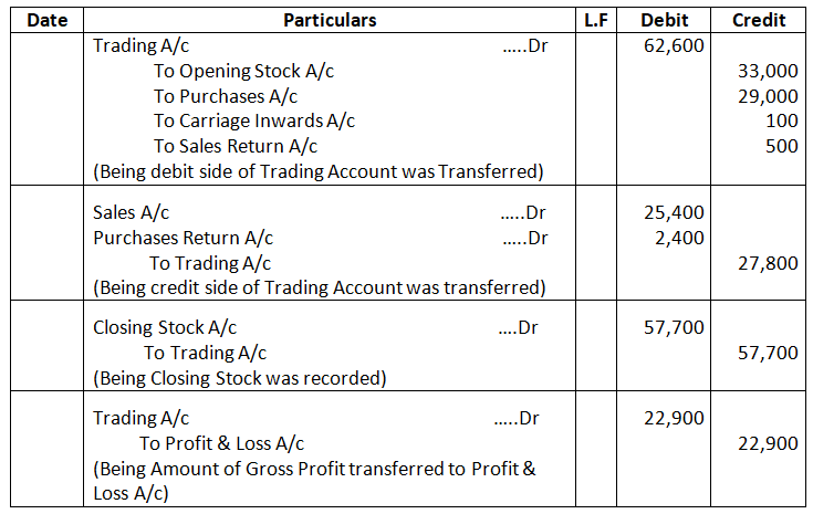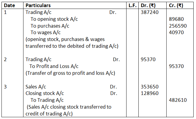 Pass Closing Journal entries on the basis of the above Trading Account. Also, transfer the Gross Profit to Profit & Loss Account.