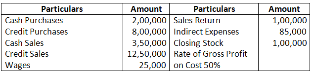 Cost of Goods Sold : Rs.2,50,000%, Gross Profit 20% on Sales.
