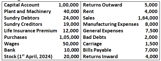 Q30. From the following Trial Balance, Prepare Trading and Profit and Loss Account for the year ended 31st March,2025 and Balance Sheet as at that date: